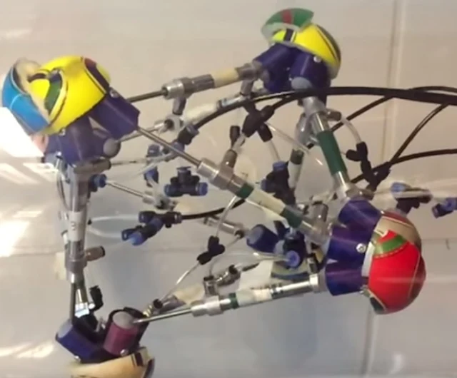 OctaWorm is a deformable octahedron burrowing robot that is currently powered by air pressure. It is developed by Juan Cristobal Zagal and has many 3d printed parts. The design enables it to move in very confined spaces.Here is a video showing its abilities and a development path of OctaWorm from early hydraulically powered prototypes: